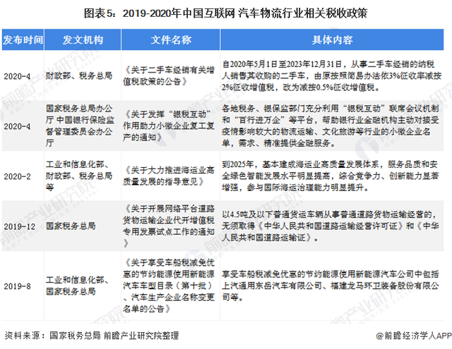 在稅收方面,國家政策對(duì)于汽車行業(yè)給予較大支持。2020年4月,《關(guān)于二手車經(jīng)銷有關(guān)增值稅政策的公告》指出,自2020年5月1日,二手車經(jīng)銷減按0.5%征收增值稅。二手車稅收的減征將有利于二手車銷售,推動(dòng)二手車汽車物流發(fā)展?!蛾P(guān)于開展網(wǎng)絡(luò)平臺(tái)道路貨物運(yùn)輸企業(yè)代開增值稅專用發(fā)票試點(diǎn)工作的通知》指出以4.5噸及以下普通貨運(yùn)車輛從事普通道路貨物運(yùn)輸經(jīng)營(yíng)的,無須取得運(yùn)輸經(jīng)營(yíng)許可證和道路運(yùn)輸證,一系列稅收和程序便利化政策推動(dòng)網(wǎng)絡(luò)平臺(tái)道路貨物運(yùn)輸企業(yè)發(fā)展。